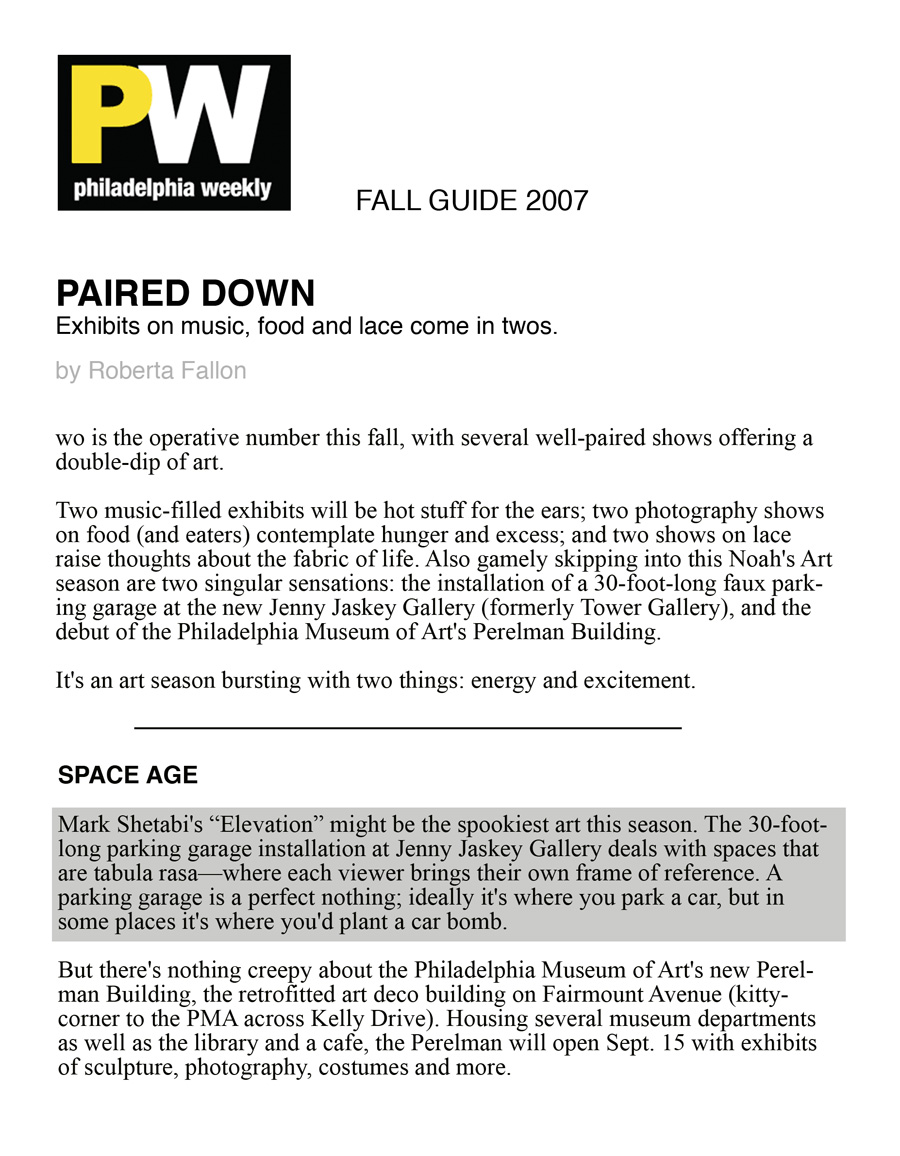 National Building Museum online Newsletter, The Parking Garage as Muse: Paintings and Sculpture by Mark Shetabi, February, 2010. https://nbm.org/the-parking-garage-as-muse/