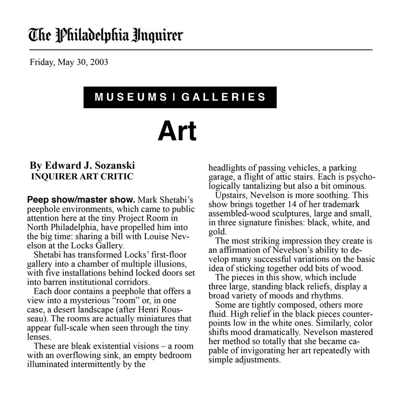 Sozanski, Edward J. Peep Show/Master Show at Locks. Philadelphia Inquirer, May 30. http://www.baileygallery.com/attachment/en/561c148d6aa72cd669c0f514/Press/5692a7355aa8370737d677a0