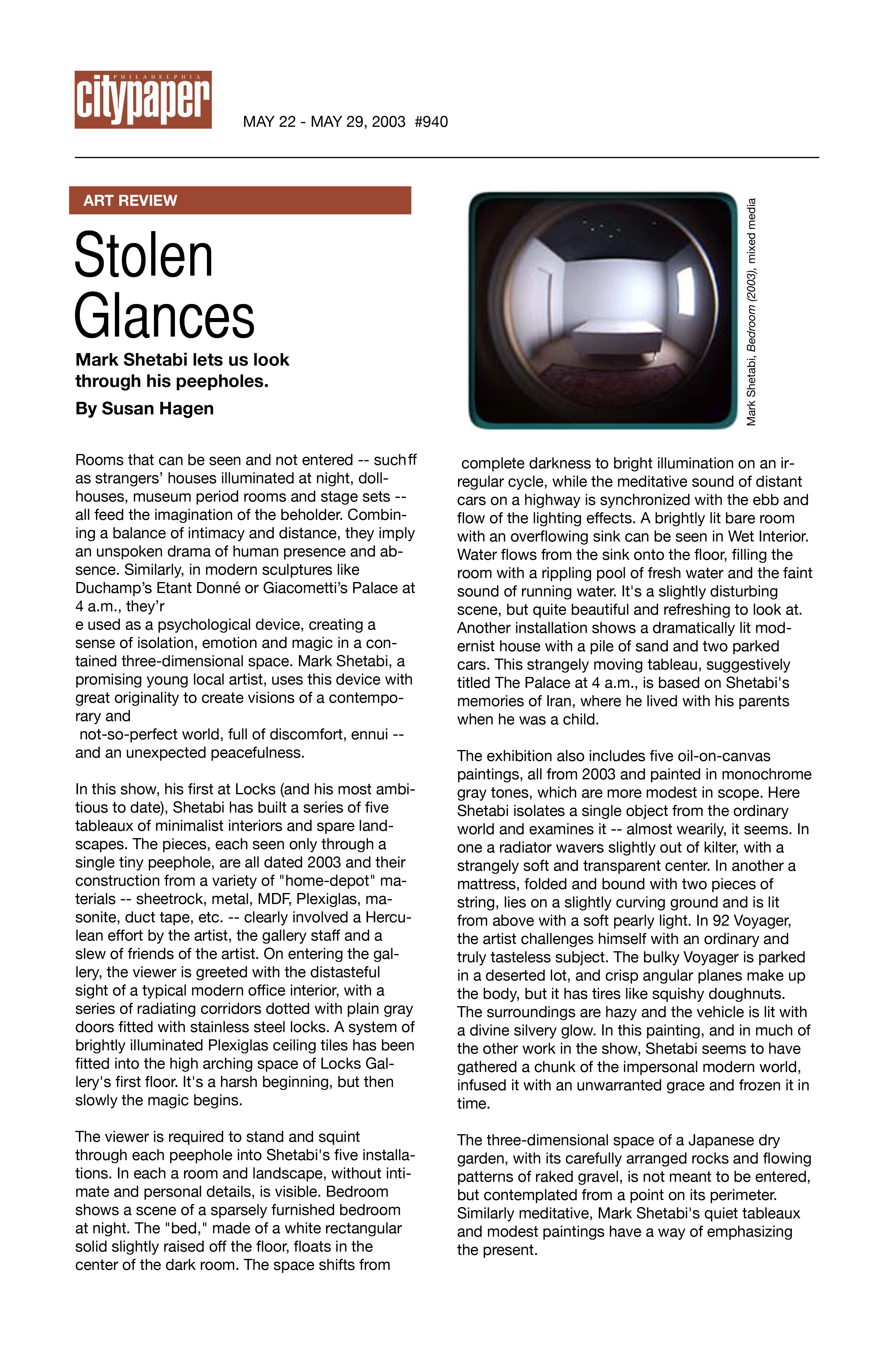 Hagen, Susan. Stolen Glances: Mark Shetabi Lets Us Look Through His Peepholes. Philadelphia City Paper, May 22. http://www.baileygallery.com/attachment/en/561c148d6aa72cd669c0f514/Press/5692a7ab5aa8377637d677a0